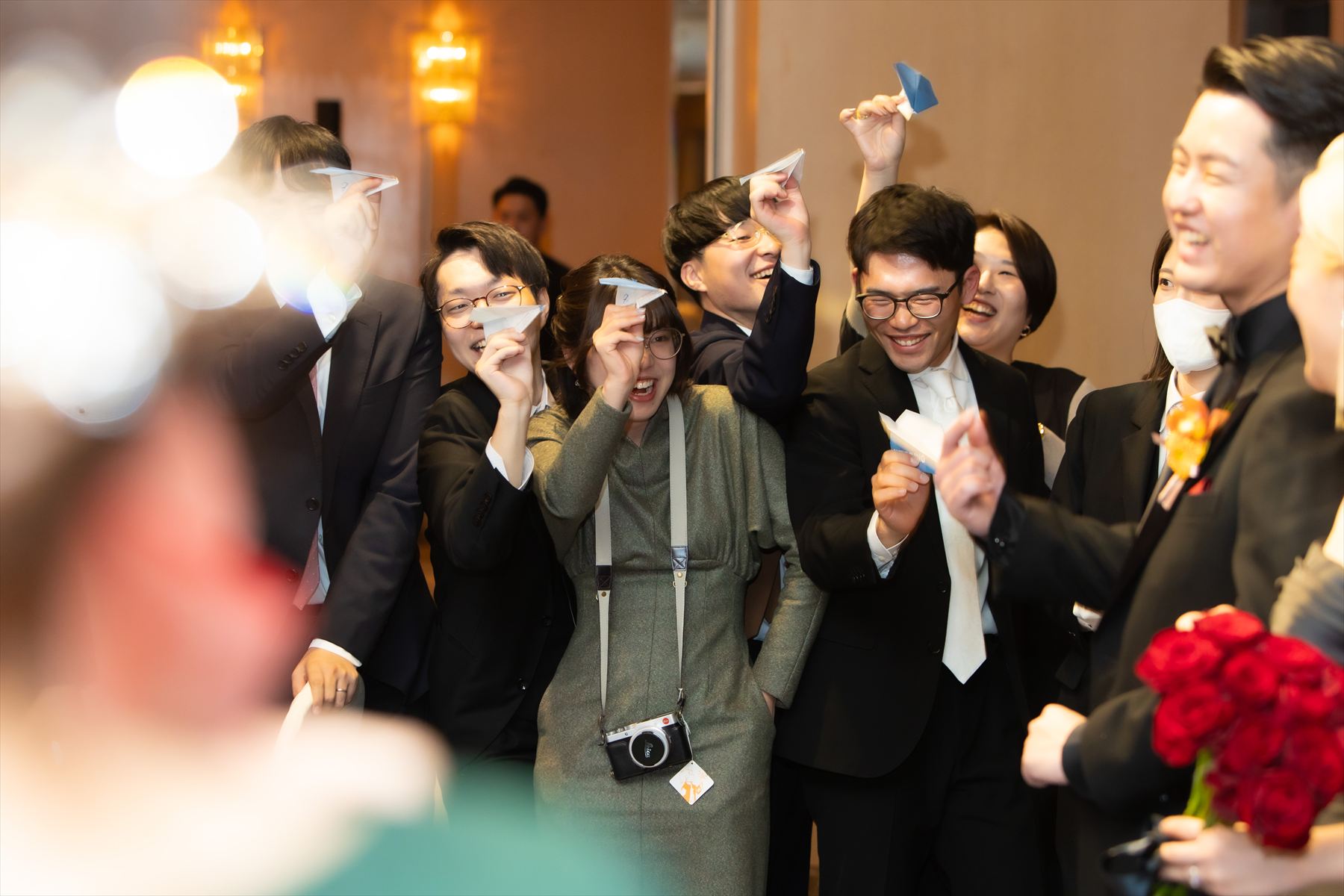 こちらの折り紙は、フラワーシャワーならぬ紙飛行機シャワーとして